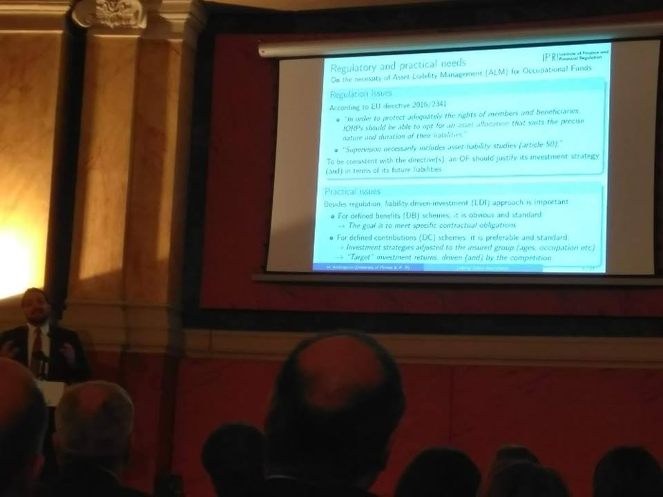 Ο Πρόεδρος της Επενδυτικής Επιτροπής του ΤΕΑ ΙΣΘ ΝΠΙΔ, Δρ. Μιχάλης Ανθρωπέλος, Επίκουρος Καθηγητής του Πανεπιστημίου Πειραιώς παρουσίασε στους τρόπους με τους οποίους ο σχεδιασμός της επενδυτικής πολιτικής ενός συνταξιοδοτικού ταμείου θα πρέπει να λαμβάνει υπόψη τις βραχυπρόθεσμες και μακροπρόθεσμες υποχρεώσεις ενός Ταμείου Επαγγελματικής Ασφάλισης. Επισήμανε την αναγκαιότητα προσαρμογής των επενδυτικών στόχων στις ειδικές ανάγκες ρευστότητας, όπως αυτές πηγάζουν από την αναλογιστική μελέτη, ενώ παρουσίασε και παραδείγματα αντίστοιχων επενδυτικών στρατηγικών οι οποίες διαμορφώνονται λαμβάνοντας υπόψη τις υποχρεώσεις των ΤΕΑ (liability investment strategies, LDI).